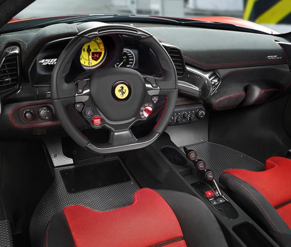 Inside, the 458 Speciale features lightweight exclusive materials, like Alcantara and carbon-fibre that give the cockpit a striking racing-inspired look, while still exuding the sense of craftsmanship and sophistication typical of all Ferrari interiors, with hand-stitching, aluminium tread plates and fluidly sculpted door panels. The cabin’s ergonomic layout is enhanced by the carbon fiber bridge that extends over central tunnel section, putting the F1 gearbox controls at an ideal angle to the driver. The seats are padded with a breathable 3D fabric for remarkable air circulation and comfort.